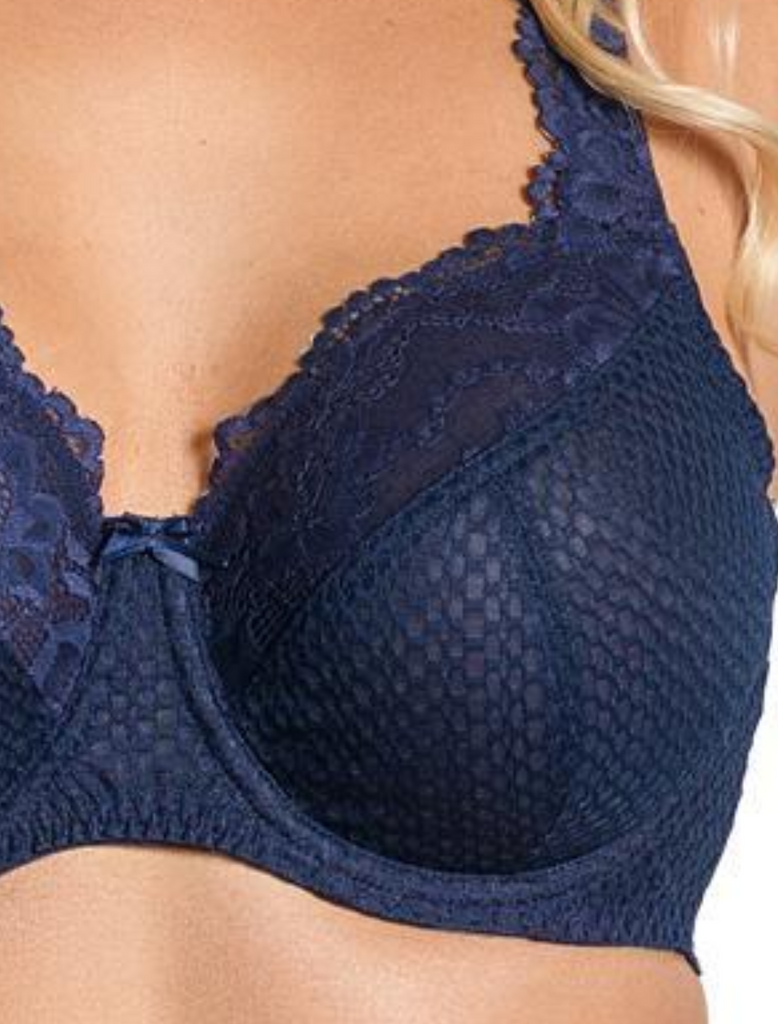 • 3-part underwire cup is unlined at bottom with Mesh Lining at back of lace panel and is free of padding and removable padding. A lightly padded support sling is added to sizes G-J.